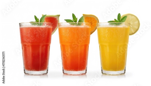 Three double-bottomed glass cups filled with lemonade in red, orange, and yellow, garnished with mint, summer refreshment