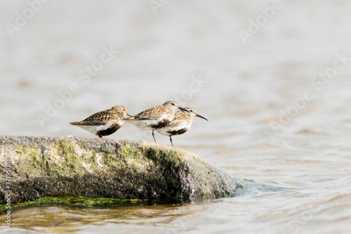 Three dunlins (Calidris alpina) resting on a stone during migration in autumn in Estonia, Northern Europe