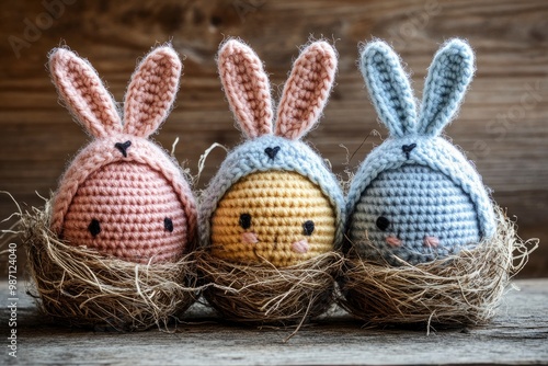 Three Easter eggs in crochet hats with bunny ears on old wooden table , ai