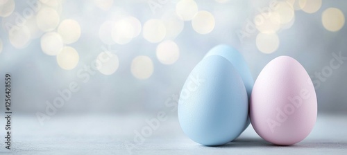 Three eggs are sitting on a table, one blue and two pink