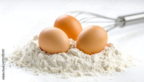 Three eggs nestled in a pile of flour, with a whisk in the background