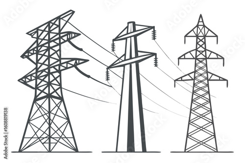 Three electricity pylons of different designs stand tall against a plain white background, isolated on white background
