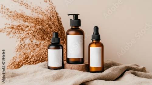 Three elegant amber glass bottle with blank labels arranged on a soft fabric surface, surrounded by dried foliage