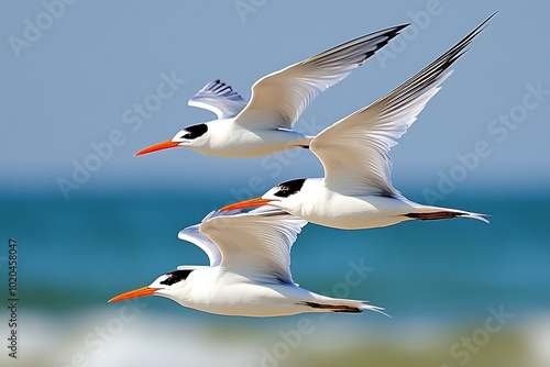 Three elegant birds in flight over a serene ocean backdrop.