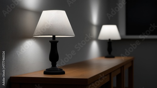 Three Elegant Desk Lamps Stacked in a Line on a Wooden Surface with Soft Lighting Effects