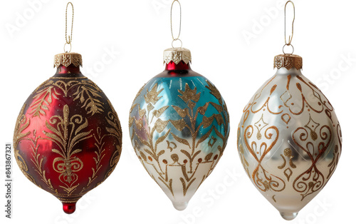 Three elegant glass Christmas ornaments with gold detailing. Red, turquoise, and white colors. Perfect for festive decorations.