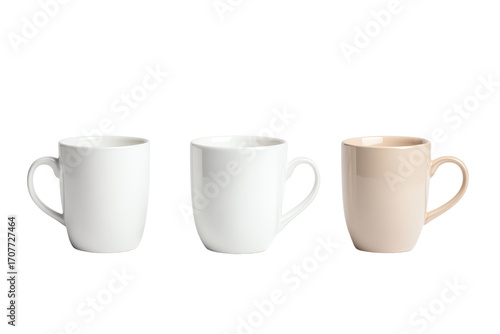 Three elegant mugs in white and beige, perfect for coffee or tea, isolated on a white background.
