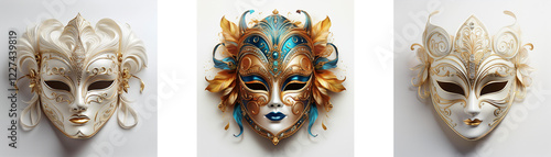 Three elegant Venetian-style masks, each with unique color palettes and elaborate hair. The craftsmanship is exquisite.