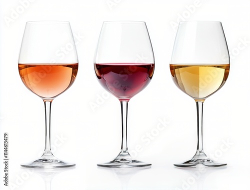 Three elegant wine glasses displaying rose, red, and white wines against a clean, bright background during a