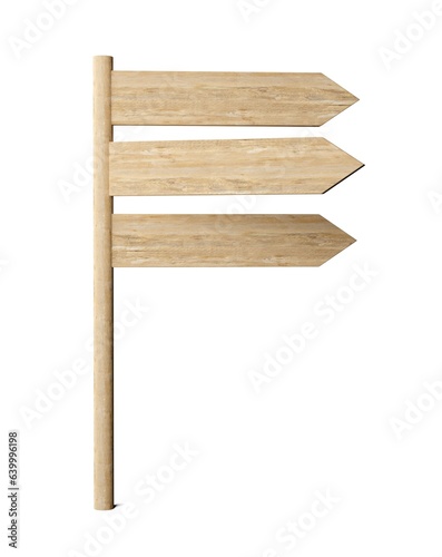 Three empty, blank wooden arrow signs pointing in the same directions, wooden board direction signs template isolated on white background