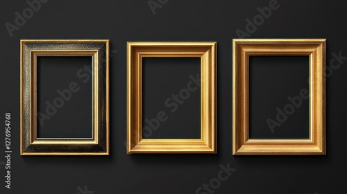 Three empty gold picture frames on dark wall in symmetrical arrangement