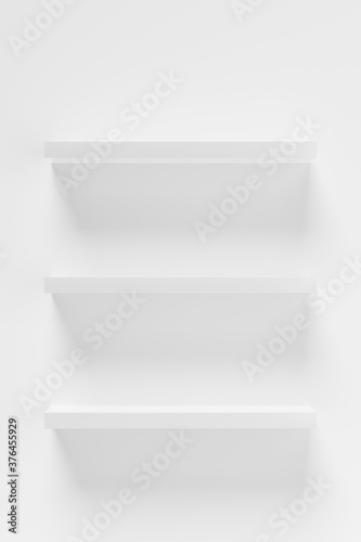 Three empty white shelfs or boards on white wall, object or product presentation template