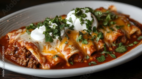 Three enchiladas with cheese, sour cream, cilantro, and red sauce on a ribbed white plate.