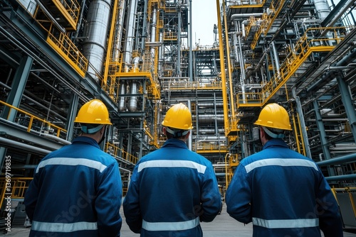 Three engineers with helmets watch the industrial landscape carefully. Illustrates teamwork, industry, and infrastructure management concepts.