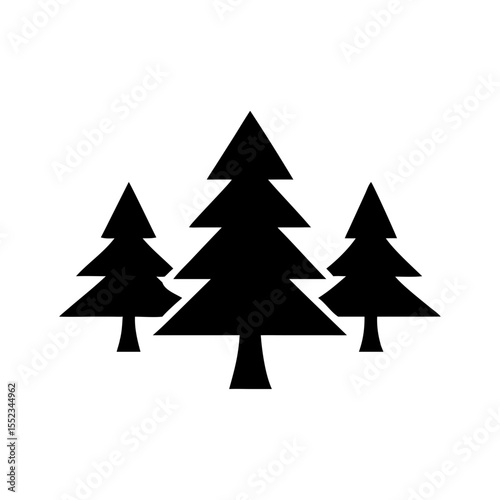 Three evergreen trees in a simple design, silhouetted against a white background and pointing upward