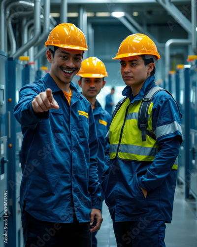 Three factory workers in blue protective gear coordinate tasks in a modern industrial corridor with bright overhead lighting
