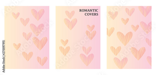 Three flyer templates in delicate pastel shades. Romantic pattern with hearts. Art can be used for brochure, flyers, packing, cover design, postacrd.