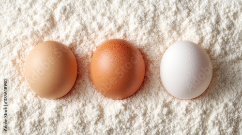 Three Fresh Eggs on a Bed of Flour Illustrating Cooking and Baking Concepts in the Culinary Arts