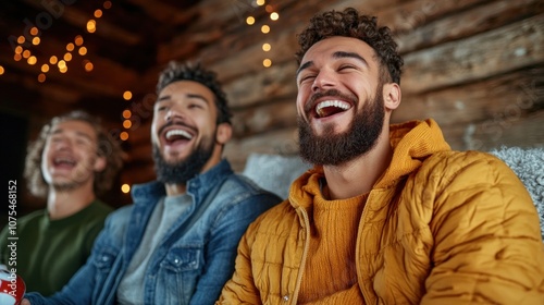 Three friends gather in a rustic cabin, sharing laughter as they watch a movie together. warm light from fairy lights creates a cozy and inviting atmosphere for their evening