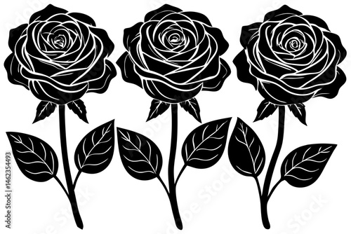Three fully bloomed roses arranged in a row silhouette design, rose, roses, flower, floral, silhouette, vector, illustration, botanical, bloom, blossom, flourish, petal, plant, row, arrangement