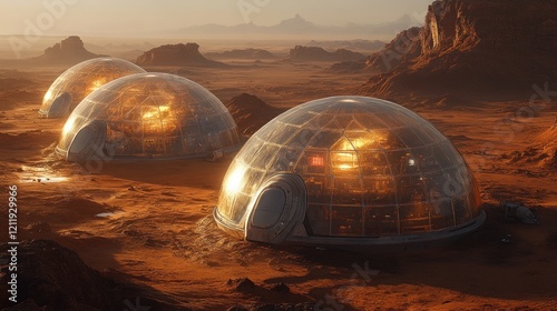 Three futuristic transparent geodesic domes on Mars' red surface at sunset.