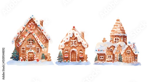 Three gingerbread houses decorated with snow and candies in watercolor style on white background