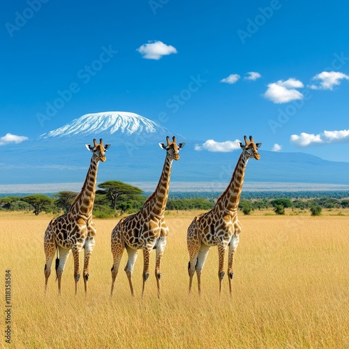 Three Giraffes in African Savanna with Mount Kilimanjaro in the Background
