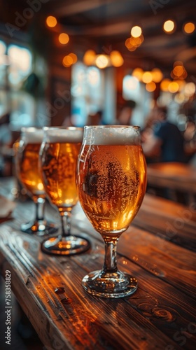 Three glasses of beer on a wooden table with a blurred bar background, evoking a cozy atmosphere