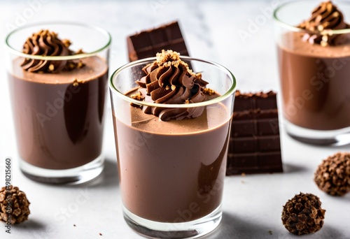 Three glasses of chocolate pudding with chocolate shavings on top.
