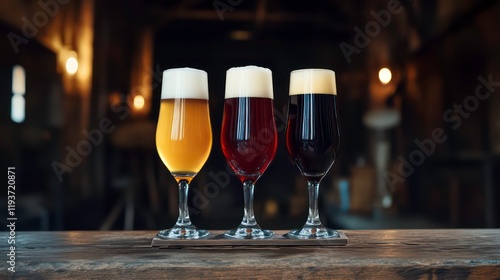 Three glasses of fresh beer, different types, blonde beer (lager beer),