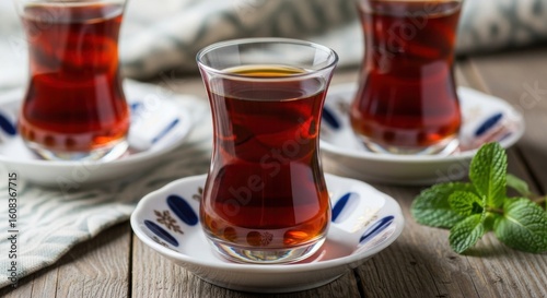 Three Glasses of Hot Dark Tea Served with Fresh Mint Leaves on a Wooden Table