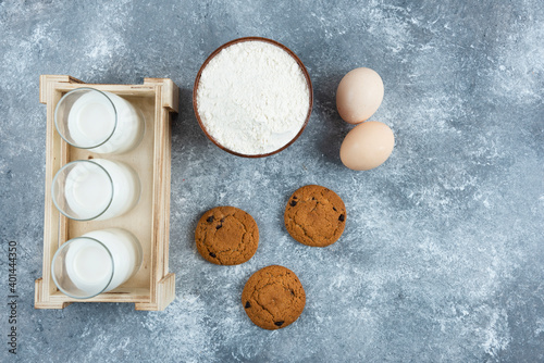 Three glasses of milk with flour and eggs on a gray background