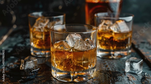 Three glasses of whiskey with ice placed on a vintage table against a black backdrop