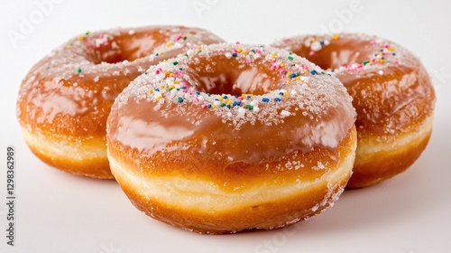 Three glazed donuts on white background