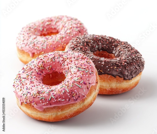 Three glazed donuts, two pink with sprinkles, one chocolate with sprinkles, on white background