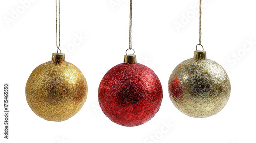 Three Glittery Christmas Ornaments Hanging Against Black Background