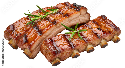 Three Glossy Grilled Pork Ribs with Rosemary on Transparent Background