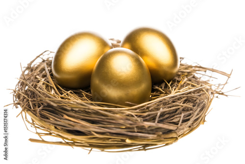 Three golden eggs in nest isolated on a white background
