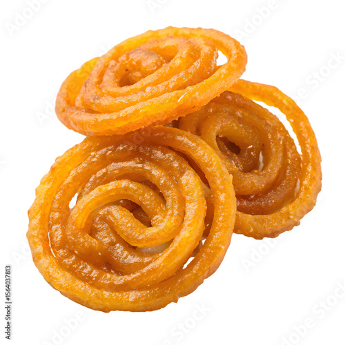 Three golden jalebi indian sweets arranged together isolated on transparent background
