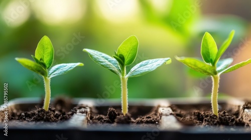 Three Green Seedlings Emerging from Soil in a Tray