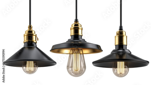 Three hanging pendant lights with black shades and gold accents showcasing Edison bulbs, cut out transparent