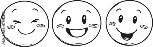 Three happy doodle emoticons with different expressions in black and white