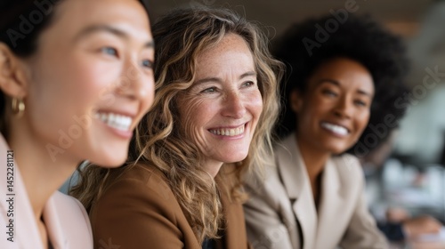 Three happy, multi-ethnic business women share a moment of joy in a well-lit, contemporary office space. Their smiles reflect the spirit of teamwork and positivity