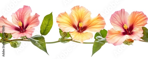 Three hibiscus flowers in peach yellow and pink with green leaves on white.