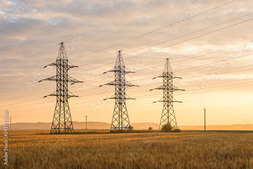 Three high-voltage poles on a wheat field in the rays of the rising sun