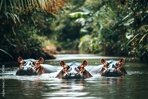Three hippos are swimming in an african river surrounded by lush jungle vegetation, showcasing their natural habitat and peaceful coexistence