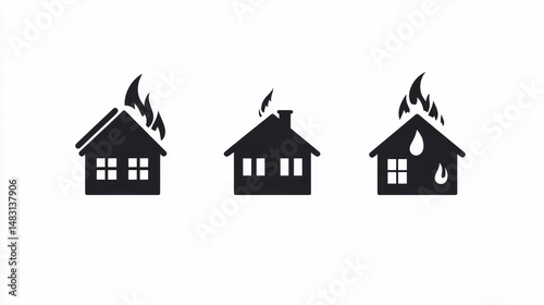 Three house icons depicting stages of fire damage; one burning, one intact, and one with water damage suggesting fire suppression