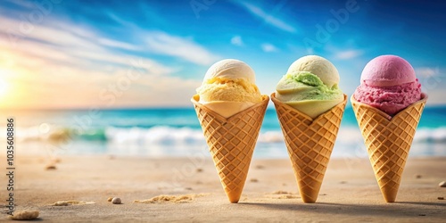 Three Ice Cream Cones Stand Tall on the Beach, Ready to Be Enjoyed on a Sunny Day
