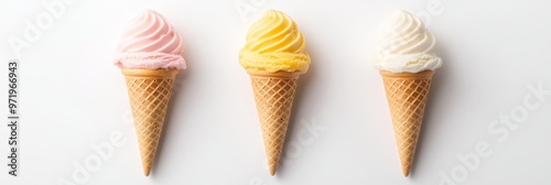 Three ice cream cones with pastel pink, yellow, and white soft serve ice cream on a white background. The cones are a classic symbol of summer, happiness, and indulgence. This image is perfect for ill