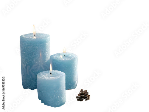 Three icy blue pillar candles with pinecone isolated on a transparent background winter